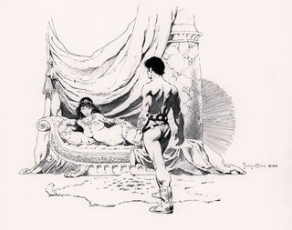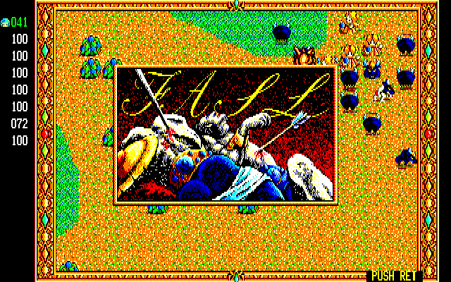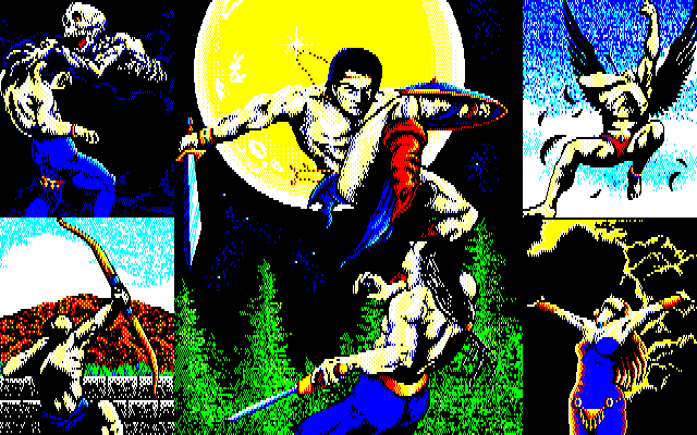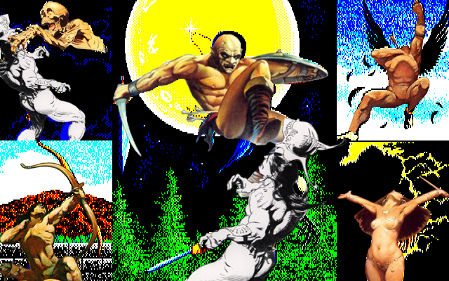 Kure Software Koubou isn’t exactly a famous name in the West, but in Japan their line of fantasy strategy games enjoyed some influence, most notably being cited as an inspiration for the Fire Emblem series. The evocative cover art by no one lesser than Yoshitaka Amano probably helped them quite a bit with that, but it seems the covers were as far as the budget took them, cause for the in-game graphics of their 1989 title Duel they plundered the Frazetta chest like few others. The first screen of the title sequence only incorporates one character from a black-and-white illustration featured in some editions of Edgar Rice Burroughs’ Swords of Mars, but his pose seems to have been cloned and increasingly modified for the entire warrior party of four.