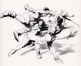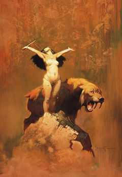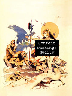 This is followed by a collage of different scenes, all of which feature elements from at least one Frazetta painting. The only character I couldn't find in a Frank Frazetta original is the soldier jumping for the head kick in the big center piece – that comparison instead comes from an anonymously credited cover painting for the first issue of Spanish fantasy and sci-fi comic magazine Cimoc. I’m sceptical about taking it for the direct influence of the Japanese game, though, especially as the rest of the art leans so heavily on Frazetta, so there might be a lost(?) work of the master that forms the missing link for both of them.